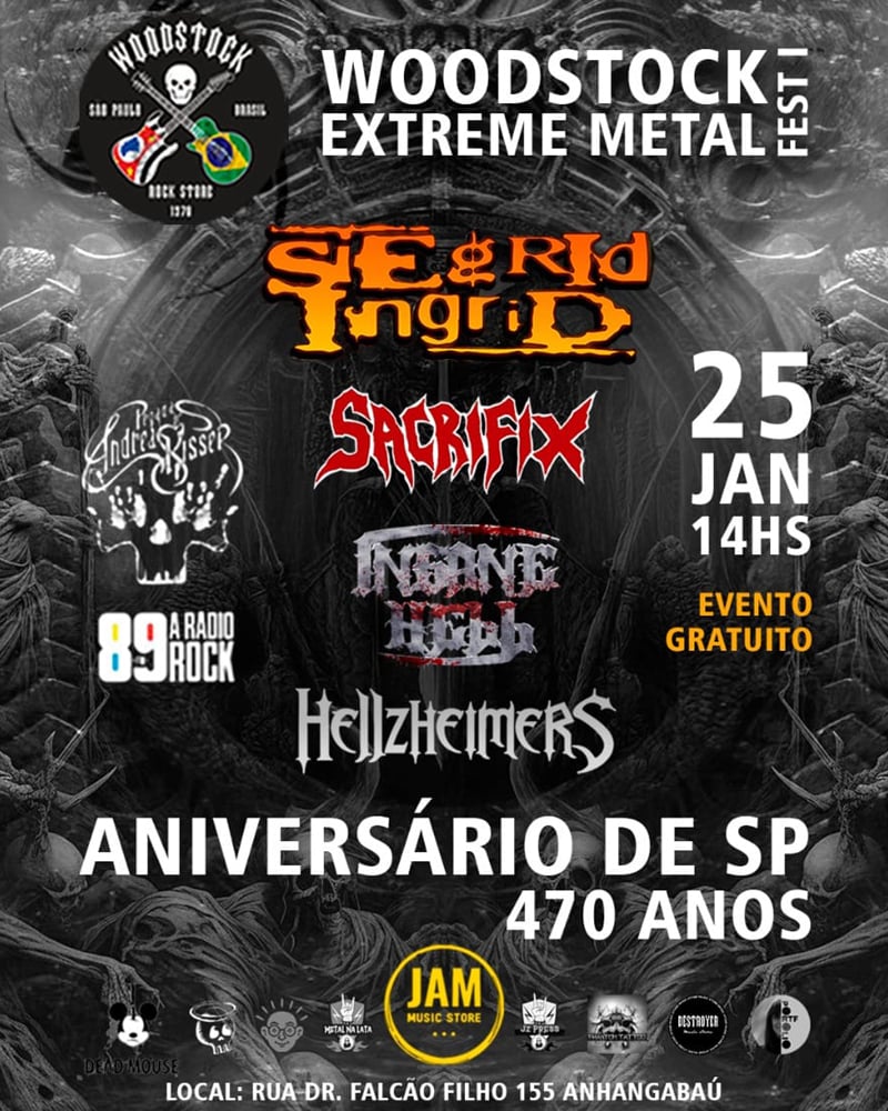 Neste aniversário de 470 anos da cidade de São Paulo, comemorado no dia 25 de janeiro, a metrópole que nunca dorme será palco de um evento histórico para os amantes do Metal pesado! O Woodstock Extreme Metal Fest I acontecerá no lendário templo do Rock e Metal paulistano, a Loja Woodstock – criada e eternizada pelo nosso querido comendador do Rock/Metal, Walcir Chalas – localizada no Anhangabaú, no coração da cidade. O evento começa às 14h e, o melhor de tudo, a entrada é gratuita!